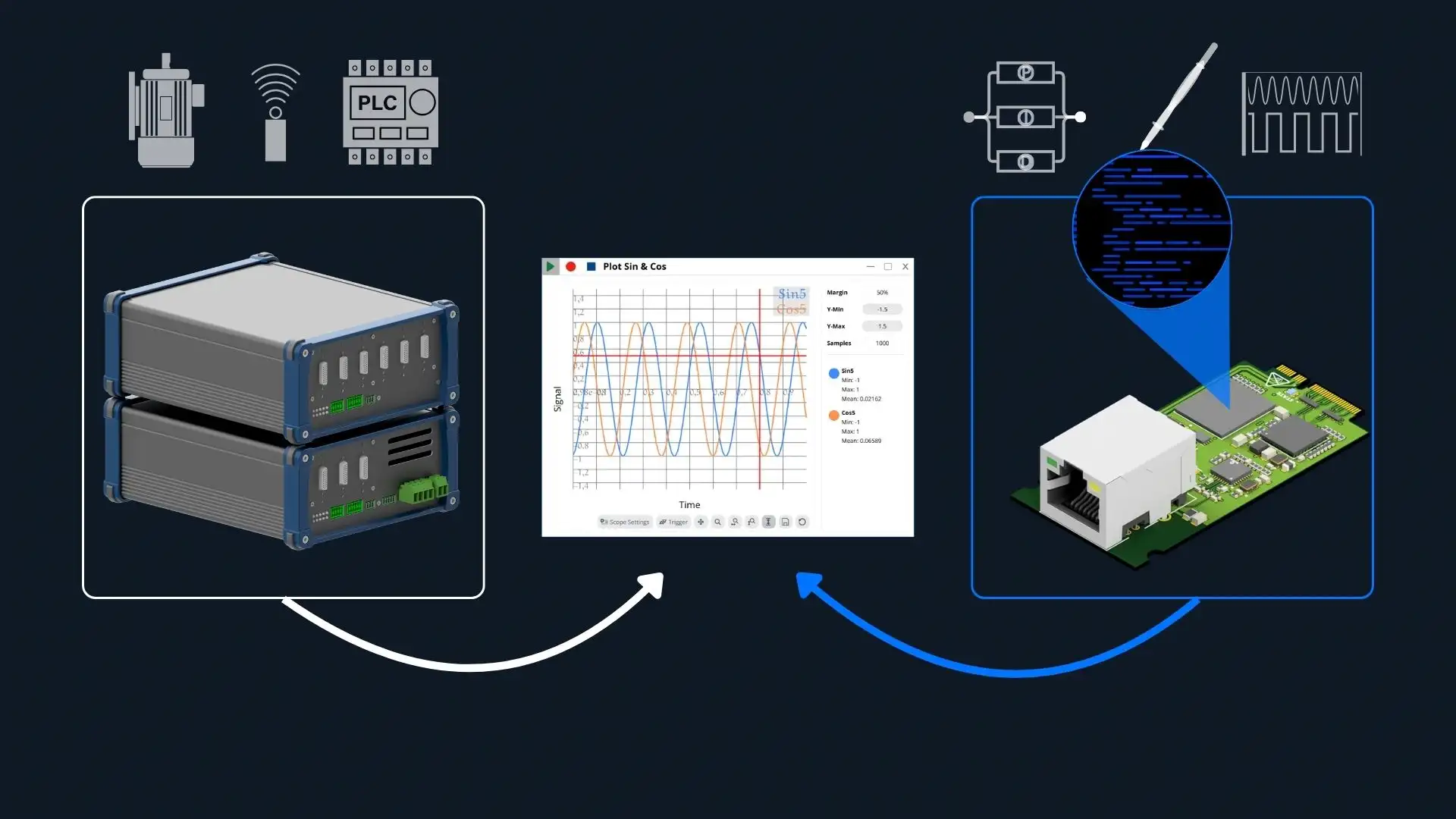 Über die Middleware es:prot interagiert es:scope® mit Software-Signalen in beliebigen Embedded-Systemen, über das DAQ es:mod mit physischen Signalen aus Sensorik, Aktorik und Prüfaufbauten.